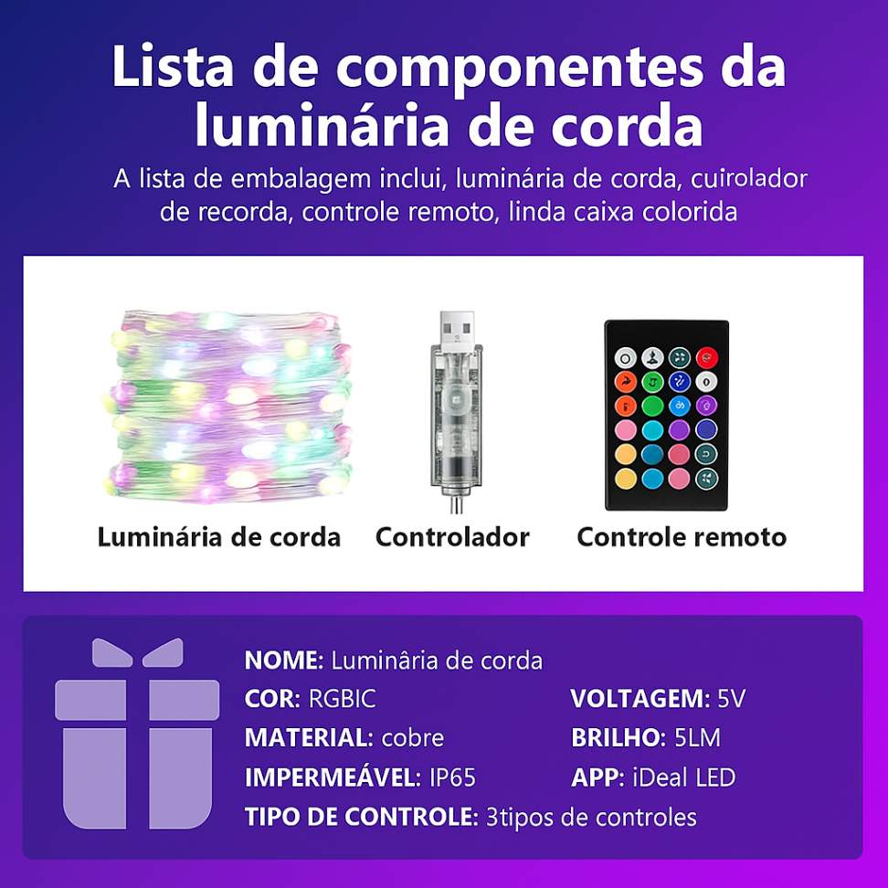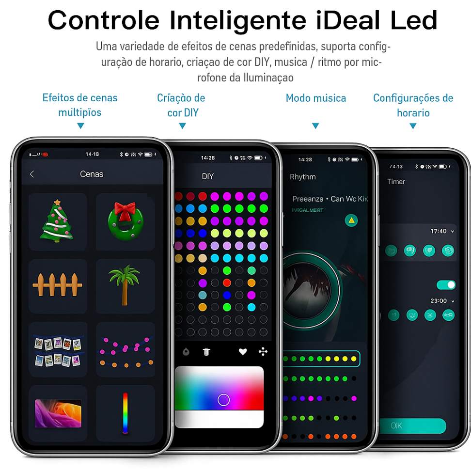 Perfeita para quartos, festas, cortinas, árvores de Natal e ambientes criativos, essa fita é controlada via Bluetooth ou controle remoto, permitindo ajustar cores, brilho e modos com apenas um toque no app iDeal LED.